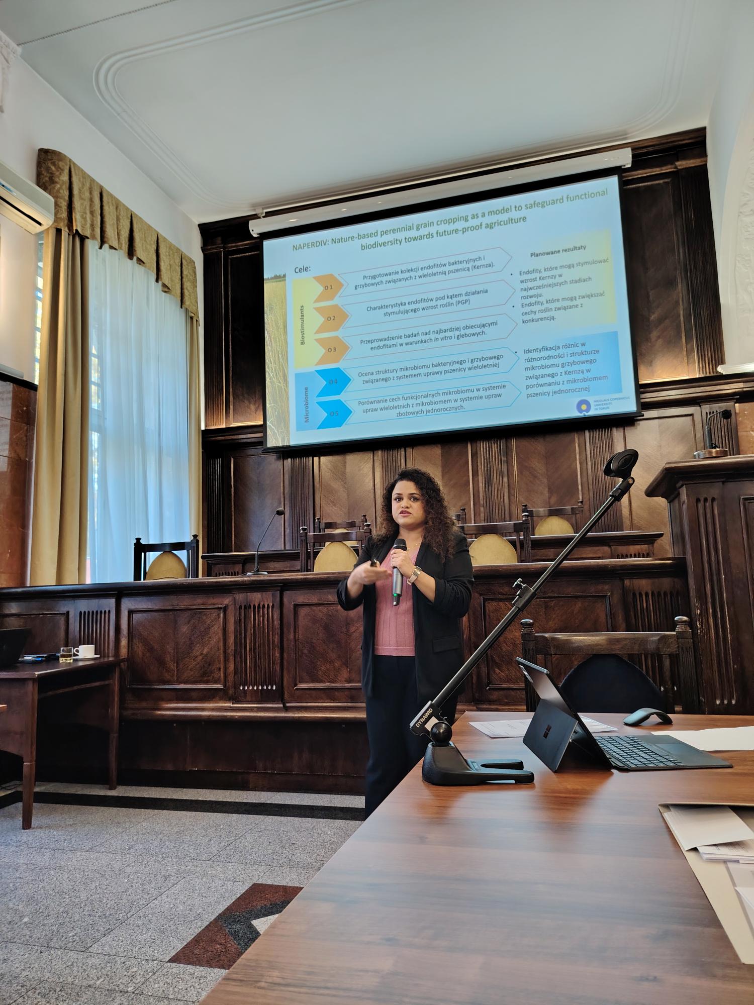W ramach sesji naukowej zaprezentowano trzy referaty o różnorodnej tematyce biotechnologicznej. Dr Julia Dłużewska (Pracownia Biologii Genomu, Instytut Biologii Molekularnej i Biotechnologii UAM w Poznaniu) omówiła publikację pt. „MSH2 stimulates interfering and inhibits non-interfering crossovers in response to genetic polymorphism” , która otrzymała Nagrodę Komitetu Biotechnologii PAN im. Wacława Szybalskiego za rok 2024. W dalszej części dr Bliss Furtado oraz dr Edyta Deja-Sikora  z Katedry Mikrobiologii UMK w Toruniu przedstawiły referat pt. „Uprawa zbóż wieloletnich jako model zachowania bioróżnorodności funkcjonalnej w przyszłościowym rolnictwie”. Z kolei prof. Katarzyna Hrynkiewicz zaprezentowała referat pt. „Biotechnologiczny potencjał Salicornia europaea: od mikrobiomu do rekultywacji gleb i bezpieczeństwa żywności”.